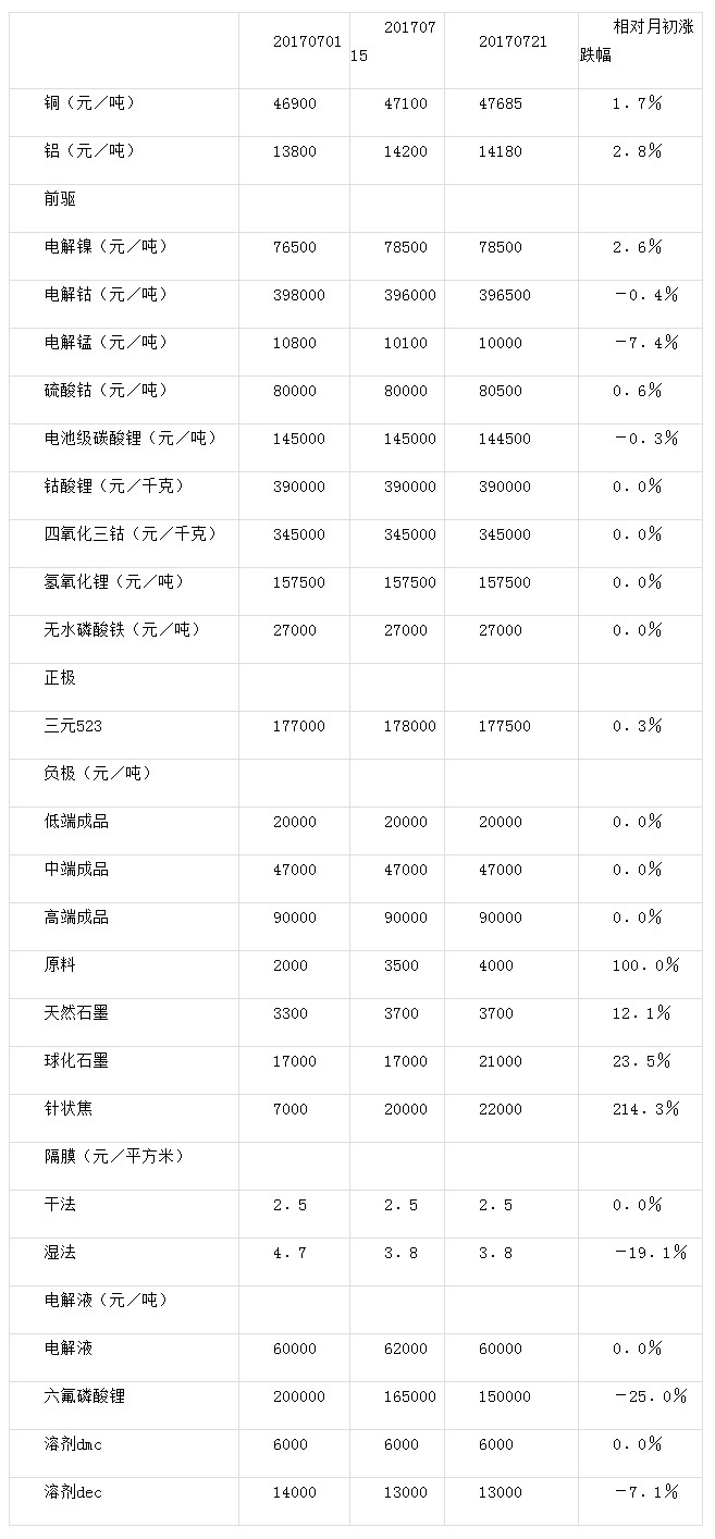 其他材料7月份價格相對平穩(wěn),電解液和隔膜降價幅度較大。