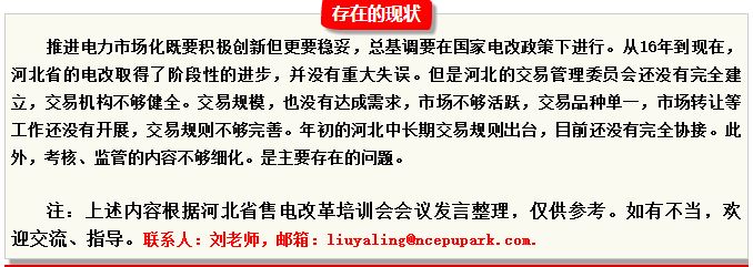 電改的內容簡單的說就是“管住中間、放開兩頭”,當前主要應該是電力市場化和電力價格方面。重點在電力市場化方面。河北電網(wǎng)分為南北兩塊,分別有河北電力交易中心和冀北電力交易中心。 2016年開展了電力直接交易工作,共有218個用戶,33個電廠參與交易,其中南網(wǎng)有123個用戶,19個電廠。北網(wǎng)有94個用戶、14個電廠參與,交易的電量是104.5億,由于2016河北開展較晚,整體交易電量不是很大。 2017年計劃,南網(wǎng)交易規(guī)模360億,北網(wǎng)同樣360億。2016年總交易電量104.5億,南網(wǎng)82.1億,北網(wǎng)是22億,共降低用電成本5.34億,從電廠側看,南網(wǎng)最高電廠降價7.86分,北網(wǎng)最高降7.04分。用戶方看,最高的降價達1毛3。 2017年,河北南網(wǎng)從2月份開始交易,進行了一次長協(xié),4次月度集中撮合,共交易的電量是138.66億,長協(xié)交易120億,月度集中交易18.66億,共降低用電成本53.2億。其中長協(xié)交易平均價格是2.84分,最高電廠側降7.66分,月度集中交易平均降價2.32分。北網(wǎng)從7月份開始交易,交易的電量是19.05億,降低成本0.73億元。平均降價是2.11分,最高降價4.92分。與周邊省份相比,處于正常水平。 2017年比較重要特殊的是,將售電公司引入到交易中,共有258個售電公司準入?yún)⒓咏灰住U嬲齾⑴c市場達成交易的售電公司43家。南網(wǎng)準入215家,達成交易的售電公司20家。北網(wǎng)準入143家售電公司,達成交易的23家。售電公司拿到電量最多的達3.86億千瓦時,最少的為1000萬。電廠給售電公司降價幅度,最大的為7.06分,平均水平為2.39分。售電公司第一次進入市場,取得這樣的成績,激活了電力交易市場。