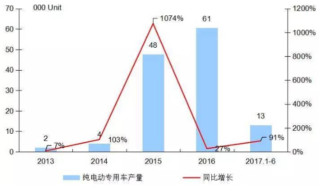 從下圖可知,以純電動物流車為主的純電動專用車市場,自2013年以來一路高歌猛進(jìn),從2013年的約2000輛,發(fā)展到2015年的4.8萬輛,2016年再度飆升至6.07萬輛,同比增長27%,相比2013年更是翻了29倍。而即使在財政補(bǔ)貼出現(xiàn)較大退坡的2017年,純電動物流車市場仍然繼續(xù)快速增長,呈現(xiàn)出旺盛的發(fā)展勢頭。