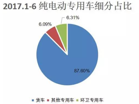 今年上半年,盡管純電動物流車占比依然居高不下,但環(huán)衛(wèi)專用車占比開始有所上升。從下圖可知,2017年1-6月,國內(nèi)純電動物流車(貨車和廂式運(yùn)輸車)占比為87.6%,比2016年的93.96%有所下降,但依然是絕對主力,也是各大車企主要投入的細(xì)分市場;環(huán)衛(wèi)專用車占比從2016年的1.8%,擴(kuò)大到2017年的6.31%。