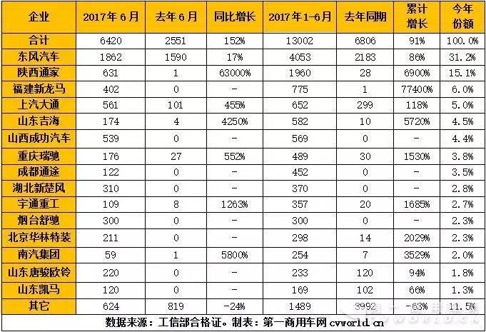 記者根據(jù)工信部合格證產(chǎn)量統(tǒng)計得知,2017年6月,國內(nèi)新能源專用車市場共計生產(chǎn)6420輛(全部為純電動車型),比去年同期大幅增長152%,其中大部分是純電動物流車;1-6月,純電動專用車市場累計產(chǎn)量達(dá)到1.3萬輛,比去年同期的6806輛增長幾乎翻番,達(dá)到91%!