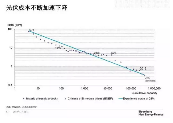 7月25日,彭博新能源財經(jīng)在京舉辦《2017新能源展望》發(fā)布會,會上,彭博新能源財經(jīng)提供出更多數(shù)據(jù)來支撐這一趨勢預(yù)測——隨著光伏的快速發(fā)展,太陽能發(fā)電成本不斷加速下降,將更進一步加快煤電的“死亡”。