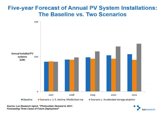 中國儲(chǔ)能網(wǎng)訊:美國勒克斯研究公司LuxResearch發(fā)布報(bào)告稱,2016年,全球新增太陽能光伏裝機(jī)容量達(dá)到75吉瓦,同比增長49%。預(yù)計(jì)到2021年,全球光伏裝機(jī)容量累計(jì)近800吉瓦,年復(fù)合增率約為6%。