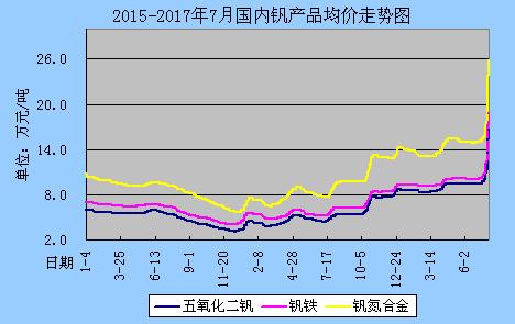 在2015年年末的時候,釩價創(chuàng)下2003年以來的新低。在釩系列的三種主要產(chǎn)品中,五氧化二釩價格在3萬/噸的水平,釩鐵價格在4萬/噸,釩氮合金價格在5.6萬/噸。隨后便開啟了反彈回升之路,至今年7月初,五氧化二釩價格已經(jīng)漲至9.5萬/噸,釩鐵價格漲至10萬/噸,釩氮合金漲至15萬/噸。盡管釩市場已經(jīng)有了大幅的上漲,但在本月各種突發(fā)性事件疊加到一起之后,其價格便出現(xiàn)了十年來不曾出現(xiàn)的直線拉升。