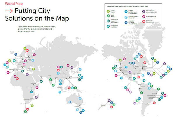100城項目分布圖。本文圖片除特殊標(biāo)注外均來自:100 solutions for climate action in cities