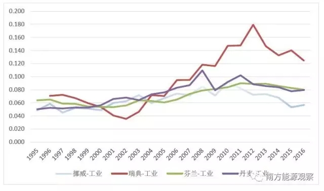 1995-2016年間,北歐四國工業(yè)電價(不含稅費)總體呈現(xiàn)波動上升的趨勢,但是近幾年電價有下降趨勢。對比批發(fā)市場價格,挪威、瑞典、丹麥基本與批發(fā)市場價格波動趨勢一致,芬蘭電價則相對平緩。北歐基本實現(xiàn)用戶側價格與批發(fā)市場價格的傳導機制。