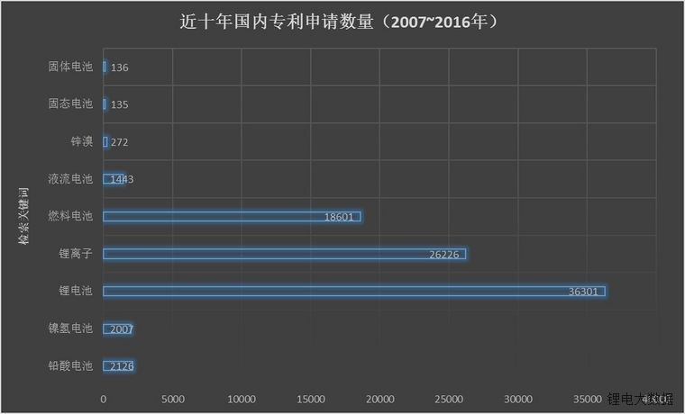 總而言之,固態(tài)電池的發(fā)展還處于早期階段,上面的數(shù)據(jù)和特性都帶有實(shí)驗(yàn)性質(zhì),距離商業(yè)化還有一段路要走。下面這張圖是固態(tài)電池和鋰電池等近十年來國內(nèi)專利申請(qǐng)量對(duì)比: