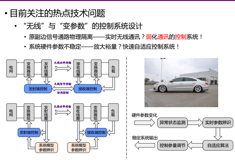 無線傳輸并不是簡單的電路問題,而是關(guān)于電磁場的問題。目前基于場的模型,包括基于能量流的模型正在進(jìn)行之中,還不是很成熟。真正的無線傳輸不是眼前的近場問題,更重要的是遠(yuǎn)場問題。目前近場無線充電技術(shù)方面主要面臨三個(gè)難題,一是控制問題,原副邊信號物理隔離進(jìn)行實(shí)時(shí)無線通訊,需要弱化通訊的控制系統(tǒng);另外隨著外部條件的變化,系統(tǒng)參數(shù)非常敏感地變化,致使傳輸功率、效率也會發(fā)生較大變化,而這些都屬于“無線”與“參數(shù)”的控制問題。