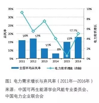 (1)2015 年,我國風(fēng)電占總發(fā)電量的3.3%。2016 年,總體發(fā)用電增長5%,風(fēng)電發(fā)電增長大約30%。就風(fēng)電在電源結(jié)構(gòu)中的份額,大約在4%左右。從最近幾年的變化來看(2011年—2016 年,見圖1),風(fēng)電棄風(fēng)率跟電力需求增長之間,并不存在明確的相關(guān)(乃至因果)關(guān)系,而可能更多地受其他因素的影響(比如裝機地區(qū)結(jié)構(gòu)、氣候條件、其他電源安排、調(diào)度自由量裁等)。
