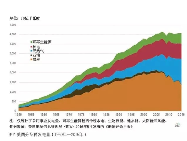 (2)2005 年—2015 年十年間,美國的風(fēng)電份額從幾乎可以忽略,上升到接近5%。同期, 其總用電量2015 年幾乎回到了2005 年的水平(見圖2)。電力需求已經(jīng)飽和,甚至略微下降。這是風(fēng)光等可再生能源快速在電力結(jié)構(gòu)中擴大份額的機會,而不是障礙。