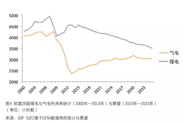(3)2005 年—2015 年10 年間,歐盟的電力消費保持穩(wěn)中有降的飽和趨勢,2015 年相比2005 年下降1%。2015 年,非水可再生能源消費比重接近20%( 見圖3), 其中風(fēng)電接近10%。丹麥、西班牙、葡萄牙以及德國等的非水可再生比重更是達到30%以上,而同期電力消費明顯下降。由于電力批發(fā)市場價格持續(xù)下跌,碳市場價格不振,邊際成本較高的天然氣發(fā)電2009 年—2015 年幾乎被徹底擠出市場(見圖4),利用率大幅下降。在2016 年,由于廉價的天然氣(部分月份低過煤炭邊際成本)可得,這一趨勢反轉(zhuǎn),天然氣發(fā)電迅速反彈。