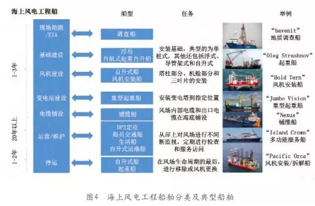 隨著項(xiàng)目的增加和技術(shù)難度的提升,海上風(fēng)電工程裝備需求大增,具體包括:起重船/平臺(tái)、風(fēng)機(jī)運(yùn)輸船、風(fēng)電安裝船/平臺(tái)、風(fēng)電運(yùn)維船、鋪纜船、供應(yīng)船、調(diào)查船等一系列工程船。其中,起重船、風(fēng)機(jī)運(yùn)輸船、鋪纜船、調(diào)查船等與其他海工船的功能并無明顯差別,在對(duì)原有工程船進(jìn)行適當(dāng)改裝后可實(shí)現(xiàn)通用。