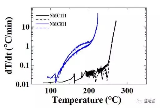 該圖是NCM811和NCM111在70℃-350℃之間自加熱速率的曲線圖。圖中顯示在105℃左右,NCM811開始發(fā)熱,而NCM111還沒有,一直到200℃時(shí)才開始出現(xiàn)了發(fā)熱。NCM811在從200℃開始,發(fā)熱速率為1℃/min,而NCM111還是0.05℃/min,這也意味著NCM811/石墨體系的電池較難通過強(qiáng)制安全認(rèn)證。