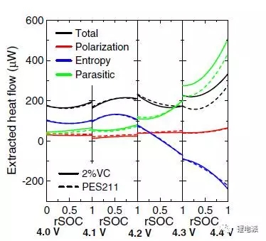 圖中顯示在4.2V電壓之上,寄生熱流突然升高,這是因?yàn)樵诟唠妷合赂叨让撲嚨恼龢O表面極易與電解液發(fā)生反應(yīng)。這也解釋了為什么充放電電壓越高電池容量維持率下降越快。
