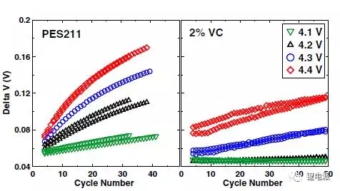 可以看出,在低截止電壓下循環(huán),電池△V較小,而電壓升高到4.3V以上時(shí),△V急劇升高,電池極化加重,這就大大影響了電池的壽命。從圖中也可以看出,VC和PES211的△V變化速率是不同的,這進(jìn)一步驗(yàn)證了電解液添加劑不同,電池極化程度、速度也是不同的。
