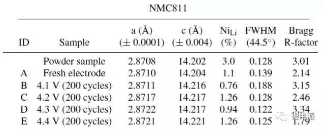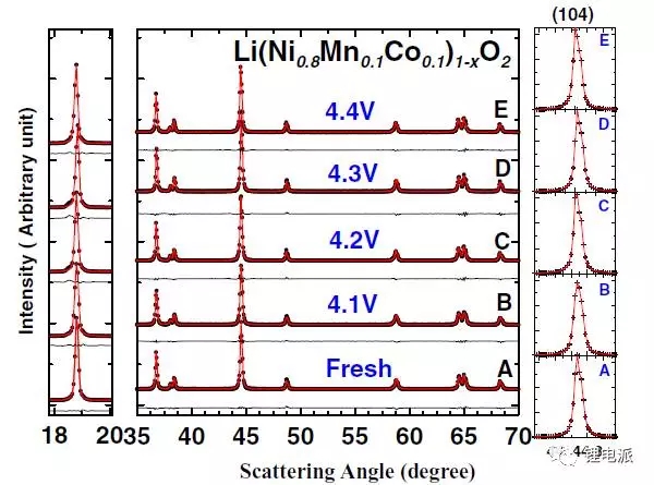 1.未循環(huán)的極片晶格常數(shù)和NCM811活物質(zhì)粉末的晶格常數(shù)是一致的。循環(huán)截止電壓是4.1V時(shí),其晶格常數(shù)也與前兩者無(wú)明顯區(qū)別,c軸有少量增加。再看循環(huán)截止電壓為4.2V、4.3V、4.4V的c軸晶格常數(shù),與4.1V的無(wú)明顯區(qū)別(差異為0.004埃),而在a軸上的數(shù)據(jù)就差異比較大了。