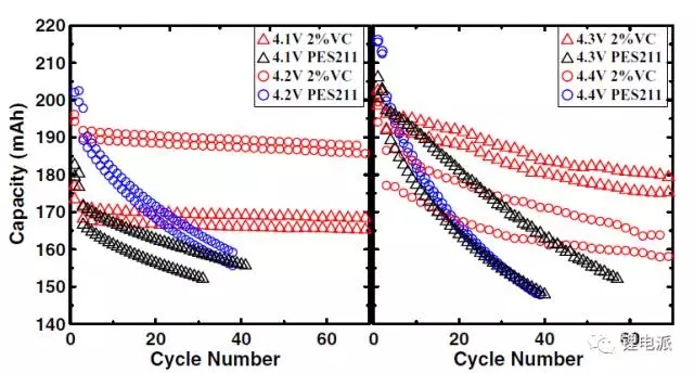 由上圖可知,添加2%VC的電池截止電壓分別為4.1V、4.2V、4.3V、4.4V時(shí),電池循環(huán)70次后其容量維持率分別為98%、98%、91%、88%。而添加PES211的電池在循環(huán)僅僅40次后,容量維持率就降為91%、82%、82%、74%。