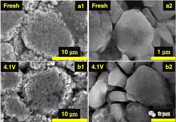 a1 a2為未經(jīng)過循環(huán)的電池SEM圖片。b~e分別為在0.5C條件下、充電截止電壓為4.1V/4.2V/4.3V/4.4V,循環(huán)200cycle后正極活物質(zhì)的SEM圖像,其中左側(cè)為低倍率下,右側(cè)為高倍率下電鏡圖片。由上圖可以看出,循環(huán)后的電池與未循環(huán)的電池在顆粒形貌、破碎程度上并沒有特別大的區(qū)別。