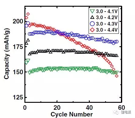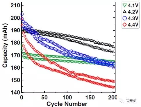 由圖中可以看出,在較高截止電壓條件下,活物質(zhì)克容量、電池容量都高,但是電池容量和材料的克容量衰減地也更快。反而是較低的截止電壓(4.2V以下)下,電池容量衰減緩慢,循環(huán)壽命更長(zhǎng)。