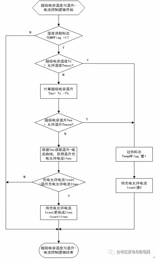 為完成充電時(shí)對(duì)超級(jí)電容的保護(hù),如圖3所示,本設(shè)計(jì)通過(guò)讀取到的超級(jí)電容溫度Tc和環(huán)境溫度Th計(jì)算出超級(jí)電容的溫升Tws,如果超級(jí)電容溫升Tws已經(jīng)超過(guò)了超級(jí)電容極限工作溫升Tmaxw,則停止對(duì)超級(jí)電容充電,直接設(shè)置TempHFlag為1。如果超級(jí)電容的絕對(duì)溫度Tc超過(guò)了超級(jí)電容最大工作溫度,則也停止對(duì)超級(jí)電容充電,設(shè)置TempHFlag為1。