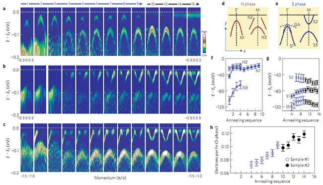 圖3. 單層FeSe/SrTiO3的能帶結(jié)構(gòu)隨著退火的演變
