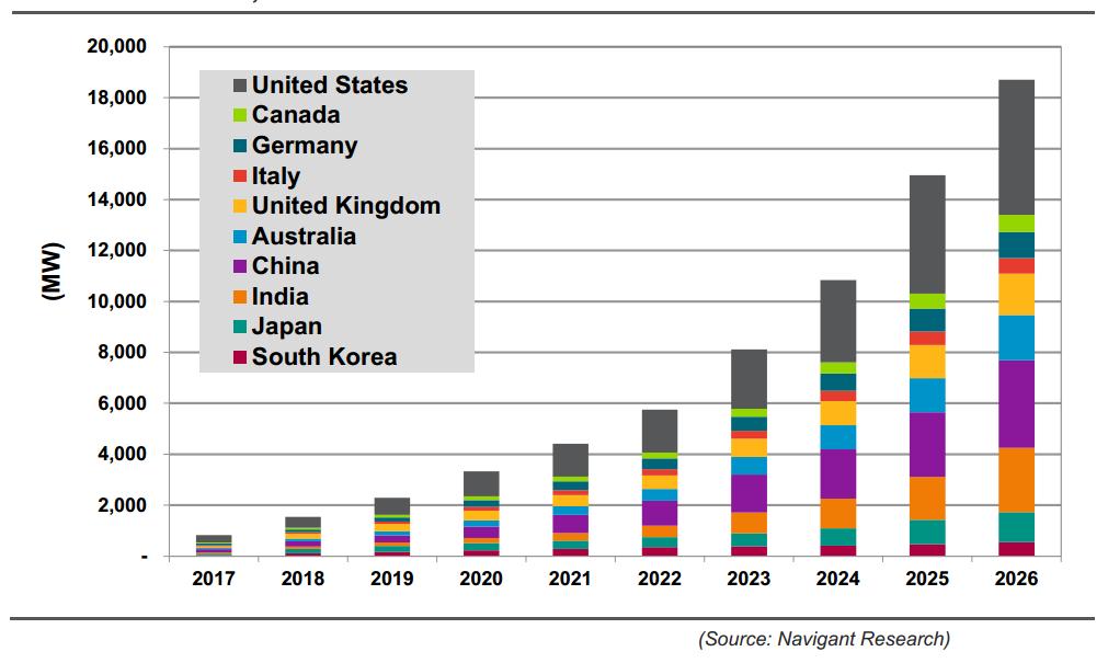 全球公用事業(yè)規(guī)模儲能年新增裝機前10名(2017-2026)