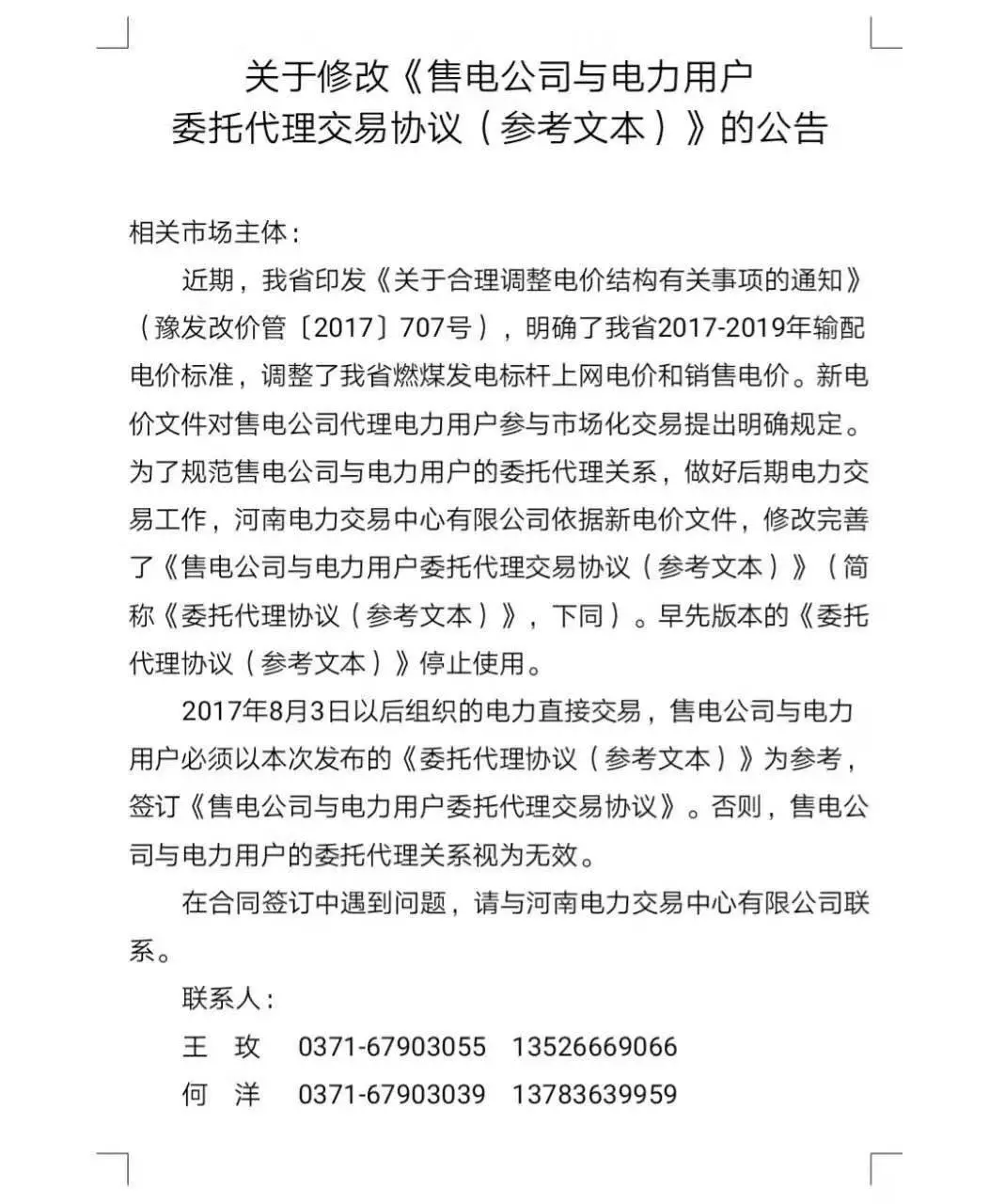 因為合同結算有很多的問題,河南省交易中心也發(fā)布了《關于修改售電公司與電力用戶委托代理交易協(xié)議(參考文本)》的公告,并希望能夠更好的杜絕以后這樣的事情發(fā)生。公告中提到了原本的委托代理協(xié)議停止使用。2017年8月3日以后組織的電力直接交易,售電公司與用戶必須要以新的委托代理協(xié)議為參考簽訂。(文末附通知公告原文件)