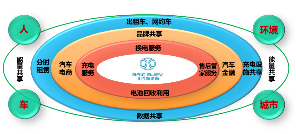 這是北汽新能源對未來的一個愿景,起步時候大家都很簡單,都是做車的,但是車離不開你的駕駛者,還有你的乘客,所以是人,但是隨著發(fā)展,一定會和環(huán)境、和城市的基礎建設互動。所以可能很簡單,就是整個生態(tài)圈,整個產品和零部件,包括換電服務、電池回收利用、充電服務、售后服務,再往外就會涉及到生態(tài)圈的一個環(huán)節(jié),包括市場、汽車金融、品牌,再往外我們所關注的是出租車、網約車、充電的分時、汽車共享,再往外就是和城市環(huán)境中最大的,有了數(shù)據流,還有一個就是能量流,這樣我們就會把人、車、環(huán)境、城市有機的結合起來,這時候將會成為未來更大的生態(tài)圈,幫助整個社會、幫助整個城市更好的接受新能源的產品、應用和推廣。