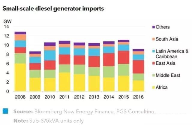 2016年,視在功率低于375kVA的柴油發(fā)電機在非洲和中東的銷量下降了25%,但可再生能源并沒有與其形成強烈的競爭,不足以解釋這種驟降。根據(jù)最近一期目前獲得的完整數(shù)據(jù)顯示,大品牌的可移動太陽能電池包市場在2016年下半年縮水8%。