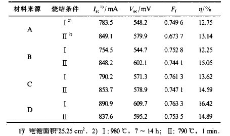 可以看到,經(jīng)高溫,長時間燒結(jié)的電池比經(jīng)低溫短時間燒結(jié)的電池其填充因子Ff都有明顯提高。說明這一燒結(jié)過程對改善歐姆接觸有良好的作用。然而,對采用A,B,C3種來源硅材料的電池來說,這以過程明顯降低了短路電流,開羅電壓而且抵消了Ff的增益,使轉(zhuǎn)換效率明顯下降。而對D材料則完全不同,長時間的高溫?zé)Y(jié)使3 個指標都有所改善,明顯提高了轉(zhuǎn)換效率。