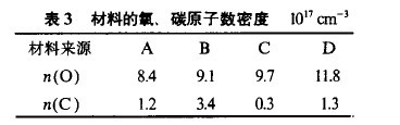 從表中可看出,D材料與前3種材料的碳,氧含量無大的差別。因而,導(dǎo)致前述差異的原因可以排除氧,碳雜質(zhì)含量的不同??赡艿脑蚴茿,B,C3種材料中金屬雜質(zhì)含量較多,高溫過程促進了金屬雜質(zhì)與氧、碳沉淀的結(jié)合,使原本"潔凈"的沉淀成為有效的復(fù)合中 心,從而使高溫吸雜達不到其應(yīng)有的目的.另外,這一差異也可能是材料中不同生長缺陷在高溫過程中發(fā)生不同演化造成的.