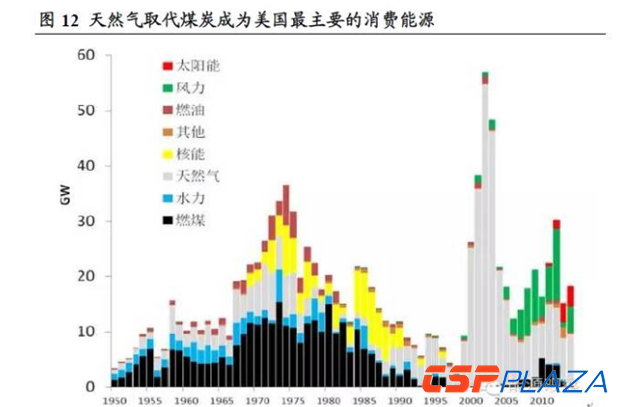 美國(guó)能源結(jié)構(gòu)主導(dǎo)者由煤炭變?yōu)樘烊粴?。美?guó)擁有世界上最大的煤炭?jī)?chǔ)量,是世界第二大煤炭生產(chǎn)國(guó),回顧美國(guó)能源發(fā)展歷史,直到20世紀(jì)80年代煤炭裝機(jī)量占比維持在較高的水平。自2000年以來(lái),隨著美國(guó)頁(yè)巖氣革命的成功和向全世界蔓延,天然氣逐漸在美國(guó)能源結(jié)構(gòu)中占據(jù)絕對(duì)主導(dǎo)地位。