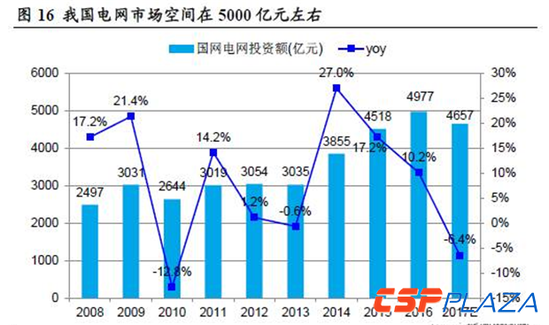 我國(guó)電網(wǎng)投資市場(chǎng)空間在5000億元左右。國(guó)家電網(wǎng)投資額從2008年2500億元增長(zhǎng)至2016年近5000億元,8年時(shí)間投資額增長(zhǎng)一倍,年均復(fù)合增速達(dá)到9%,近年國(guó)家電網(wǎng)投資額保持在4500億元以上,投資額增速逐年下降,市場(chǎng)空間保持在5000億元左右。2017年投資額增速預(yù)估為-6.4%,相較于2016年10.2%的增速下降趨勢(shì)十分明顯。