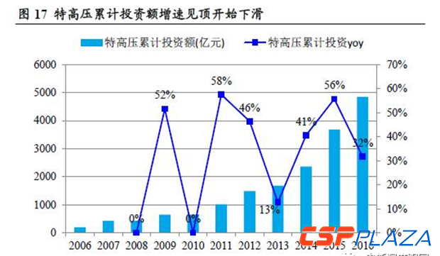 特高壓投資額增速陷入瓶頸期。特高壓累計(jì)投資額在2012年之前年均復(fù)合增速在20%左右,2014年開(kāi)始進(jìn)入快速增長(zhǎng),2015年增速超過(guò)50%,增速接近天花板,2016年特高壓累計(jì)投資額增速同比下降超過(guò)20個(gè)百分點(diǎn),這一趨勢(shì)受我國(guó)電網(wǎng)投資額整體減速影響較大。