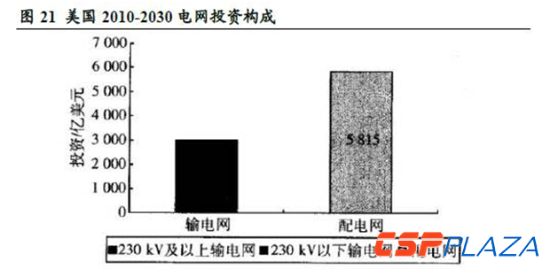 2010-2030年的20年間,在電網(wǎng)建設(shè)投資中,配電網(wǎng)投資將達(dá)到5815億美元,接近輸電網(wǎng)投資額的兩倍,整體上看電網(wǎng)年均投資額為440億美元。