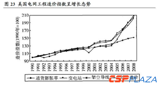 美國(guó)電網(wǎng)建設(shè)成本呈現(xiàn)上漲態(tài)勢(shì)。①電源結(jié)構(gòu)變化提出長(zhǎng)距離輸電線路建設(shè)需求:可再生能源如風(fēng)電、地?zé)岚l(fā)電裝機(jī)增長(zhǎng)較快,出于環(huán)保和燃料供應(yīng)的考慮,這些電廠一般都遠(yuǎn)離負(fù)荷中心,需要新建長(zhǎng)距離輸電線路,直接推動(dòng)了輸電網(wǎng)投資的上升。②電網(wǎng)項(xiàng)目建設(shè)成本上漲。原材料、土地、人工成本的上升都給電網(wǎng)項(xiàng)目建設(shè)造成很大的成本壓力。