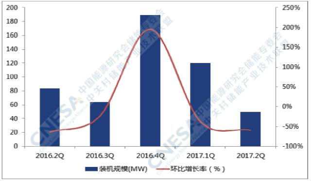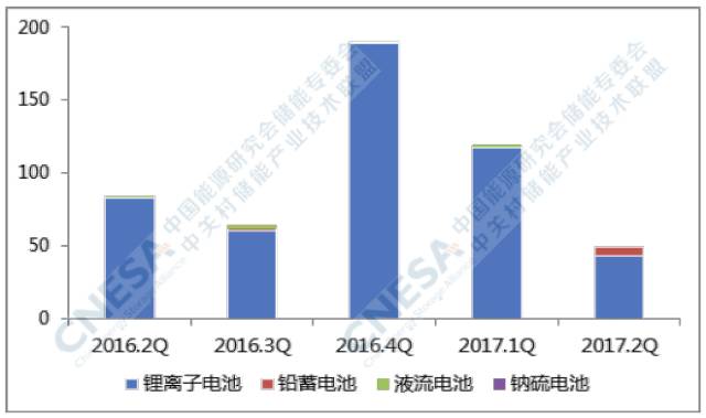 從技術分布上看,全球新增投運項目中,主要以鋰離子電池和鉛蓄電池的應用為主,且鋰離子電池的裝機規(guī)模最大,為43.2MW,所占比重為87%,同比下降35%,環(huán)比2017年一季度下降64%。