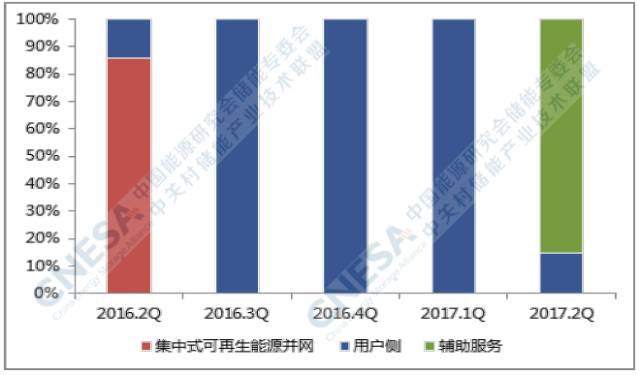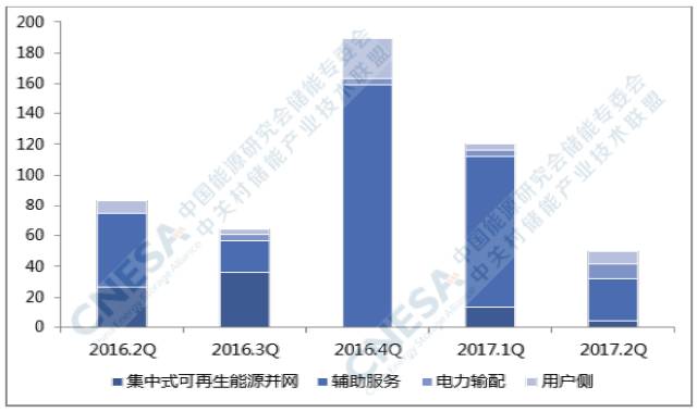 從應用分布上看,全球新增投運項目中,輔助服務領域的裝機規(guī)模最大,為28MW,所占比重為56%,同比下降42%,環(huán)比2017年一季度下降72%。