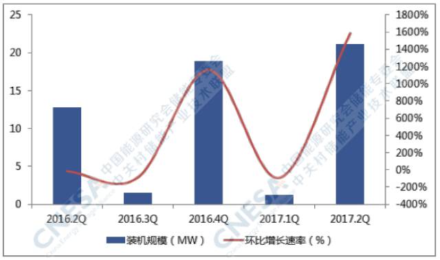2017年二季度,中國新增投運電化學儲能項目的裝機規(guī)模為21.1MW,同比增長65%,環(huán)比2017年一季度增長1588%。華北地區(qū)的新增投運裝機規(guī)模最大,所占比重為91%。