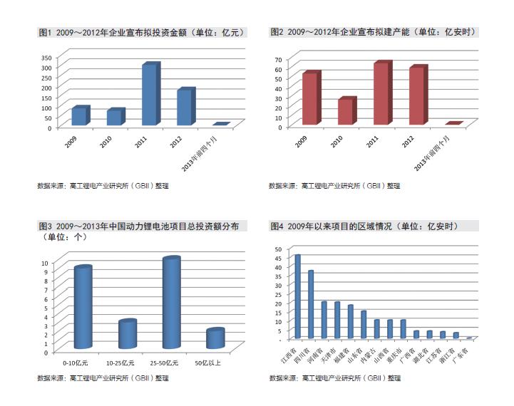 中央和地方政府陸續(xù)公布促使新能源汽車發(fā)展的政策。動(dòng)力鋰電池是新能源汽車的核心部件,新能源汽車的發(fā)展對(duì)其具有促進(jìn)的作用。高工產(chǎn)業(yè)研究所對(duì)2009~2013年新建的投資項(xiàng)目進(jìn)行統(tǒng)計(jì),2009~2012年,企業(yè)項(xiàng)目宣布的擬投資總金額高達(dá)630億元,擬建產(chǎn)能達(dá)到201億安時(shí)。2012年企業(yè)項(xiàng)目宣布的擬投資金額為170億元,擬建產(chǎn)能58.9億安時(shí)。