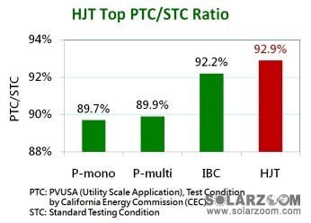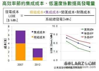 最重要的是整體組件價格下降之后,集成成本(BOS)對電池成本的比例變成3:1,因組件、逆變器與系統(tǒng)架構(gòu)等材料與人工成本已達到極限,因此只有靠采用如HIT的高效率太陽電池,來節(jié)省所需配套的BOS數(shù)量,降低整體發(fā)電系統(tǒng)的造價。HIT電池同時具有"低溫度系數(shù)"與"沒有電位誘發(fā)衰減"的特性,符合目前市場的需求。