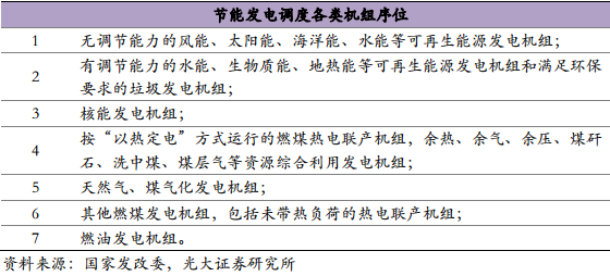 為實(shí)現(xiàn)提高電力源使用效率,減少環(huán)境污染,促進(jìn)能源和電力結(jié)構(gòu)調(diào)整,國家發(fā)改委2007年頒布了《節(jié)能發(fā)電調(diào)度辦法》,在保障電力可靠供應(yīng)的前提下,按照節(jié)能、經(jīng)濟(jì)的原則,優(yōu)先調(diào)度可再生發(fā)電資源,按機(jī)組能耗和污染物排放水平由低到高排序,依次調(diào)用化石類發(fā)電資源,如下表。其中特別指出的是:同類型火力發(fā)電機(jī)組按照能耗水平由低到高排序,節(jié)能優(yōu)先;能耗水平相同時(shí),按照污染物排放水平由低到高排序。