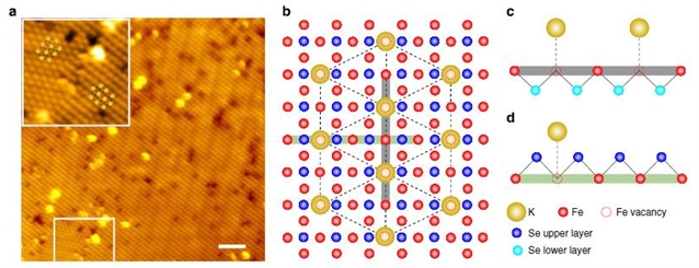 c,d當K原子處于Fe空位上方時的K、Fe和Se原子的提取分部的結構