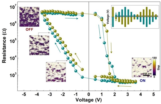 鐵電隧道結(jié)是一個(gè)金屬/超薄鐵電薄膜/金屬三明治結(jié)構(gòu),以幾個(gè)納米厚度的鐵電層作為電子隧穿勢壘,鐵電層中自發(fā)極化翻轉(zhuǎn)使得勢壘高度在高低兩個(gè)值中變化,而從在隧道結(jié)中獲得高、低兩個(gè)非揮發(fā)電阻態(tài)。鐵電隧道結(jié)具有非破壞性讀出、高存儲密度、超快數(shù)據(jù)訪問、低能耗等優(yōu)勢,因而被認(rèn)為有望突破傳統(tǒng)的非揮發(fā)存儲的瓶頸。鐵電隧穿阻變的電阻開關(guān)比越高,應(yīng)用前景越明朗,但是以往的工作得到的電阻開關(guān)比只有幾倍到幾百倍,限制了它的應(yīng)用前景。