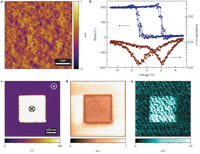 aSrTiO3薄膜的表面形貌,b鐵電性能,cd針尖寫入的疇結(jié)構(gòu),e于疇結(jié)構(gòu)對應(yīng)的隧穿電流分布