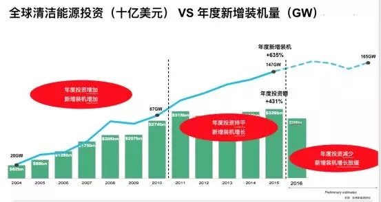 彭博新能源財(cái)經(jīng)分析師劉雨菁在索比光伏網(wǎng)西安舉辦的“光伏創(chuàng)新領(lǐng)跑技術(shù)論壇”上發(fā)布了自己預(yù)測(cè):2017年以后,光伏電站新增裝機(jī)增長(zhǎng)將放緩,甚至隨著新能源發(fā)電成本下降,投資額下降,這可能是十余年來(lái)首次。