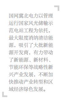 國(guó)網(wǎng)冀北電力以管理運(yùn)行國(guó)家風(fēng)光儲(chǔ)輸示范電站工程為依托,最大限度消納清潔能源,吸引了大批新能源開發(fā)商,有力帶動(dòng)了相關(guān)產(chǎn)業(yè)鏈的發(fā)展。目前,以張家口為重點(diǎn)的冀北地區(qū),不僅成為國(guó)家批復(fù)的首批千萬(wàn)千瓦級(jí)風(fēng)電基地之一,同時(shí)還涌現(xiàn)了一批規(guī)?;奶?yáng)能光伏電站,被譽(yù)為中國(guó)的“新能源之都”。