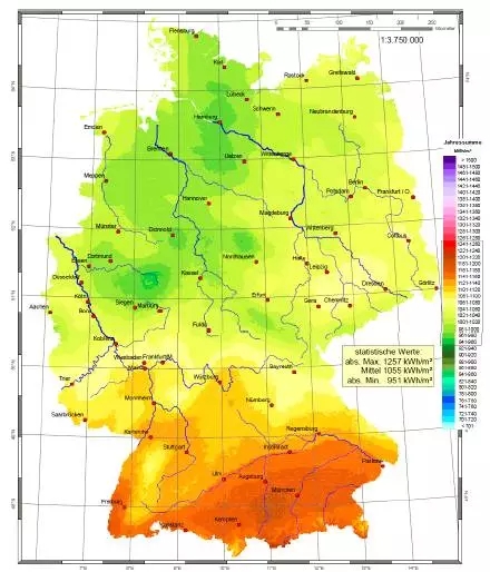 德國的日照條件并不好。年平均日照強度,最高的地區(qū)為1257千瓦時/平方米,最低的地區(qū)為951千瓦時/平方米,平均為1055千瓦時/平方米,比中國三類地區(qū)的平均日照強度還要低。下圖是德國的日照強度地圖: