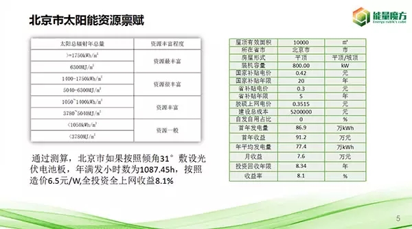通過測算,北京市如果按照傾角31°敷設光伏電池板,年滿發(fā)小時數(shù)為1087.45h,按照造價6.5元/W,全投資全上網(wǎng)收益8.1%。