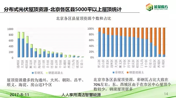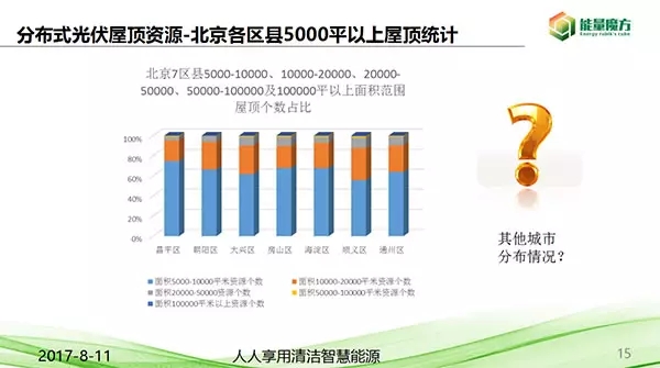 能量魔方北京市屋頂資源數(shù)據(jù)統(tǒng)計中分析,北京的七個區(qū),通州、大興、朝陽、昌平、順義、海淀、房山是屋頂最多的區(qū)域。將北京七個區(qū)的屋頂按照不同的面積不同級別統(tǒng)計以后,發(fā)現(xiàn)5000-10000平的屋頂數(shù)目占比約60%,10000-20000平的屋頂數(shù)目占比約25%,從北到南取四個城市,天津、蘇州、上海、深圳對比分析,各面積范圍屋頂資源占比,得出的結果5000-10000占比60%,10000-20000占比25%,得出類比于著名的雅各布·博爾碎片規(guī)律,可提出一個理論,一所綜合性城市的工商業(yè)屋頂面積范圍分布規(guī)律是,5000至10000平屋頂個數(shù)占比約60%,10000至20000平屋頂個數(shù)占比約25%。85%的屋頂都是2000-5000平米之內.大量的面積針對中小型企業(yè)。